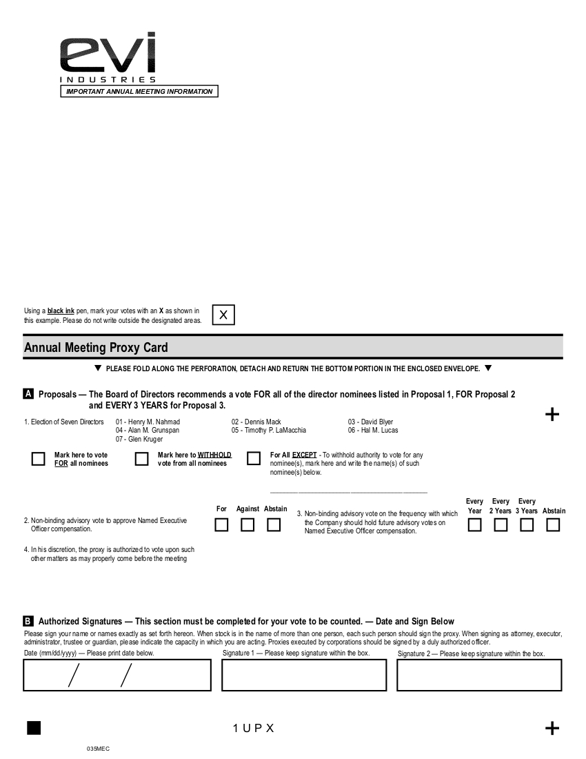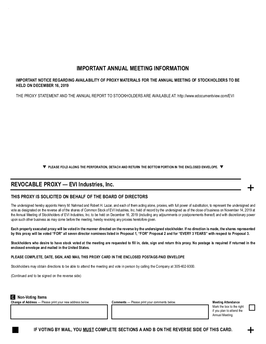 .. IMPORTANT ANNUAL MEETING INFORMATION IMPORTANT NOTICE REGARDING AVAILABILITY OF PROXY MATERIALS FOR THE ANNUAL MEETING OF STOCKHOLDERS TO BE HELD ON DECEMBER 16, 2019 THE PROXYSTATEMENT AND THE ANNUALREPORTTO STOCKHOLDERS ARE AVAILABLE AT: http://www.edocumentview.com/EVI • PLEASE FOLD ALONG THE PERFORATION, DETACH AND RETURN THE BOTTOM PORTION IN THE ENCLOSED ENVELOPE. • REVOCABLE PROXY— EVI Industries, Inc. + THIS PROXY IS SOLICITED ON BEHALF OF THE BOARD OF DIRECTORS The undersigned hereby appoints Henry M. Nahmad and Robert H. Lazar, and each of them acting alone, proxies, with full power of substitution, to represent the undersigned and vote as designated on the reverse all of the shares of Common Stock of EVI Industries, Inc. held of record by the undersigned as of the close of business on November 14, 2019 at the Annual Meeting of Stockholders of EVI Industries, Inc. to be held on December 16, 2019 (including any adjournments or postponements thereof) and with discretionary power upon such other business as may come before the meeting, hereby revoking any proxies heretofore given. Each properly executed proxy will be voted in the manner directed on the reverse by the undersigned stockholder. If no direction is made, the shares represented by this proxy will be voted “FOR” all seven director nominees listed in Proposal 1, “FOR” Proposal 2 and for “EVERY 3 YEARS” with respect to Proposal 3. Stockholders who desire to have stock voted at the meeting are requested to fill in, date, sign and return this proxy. No postage is required if returned in the enclosed envelope and mailed in the United States. PLEASE COMPLETE, DATE, SIGN, AND MAIL THIS PROXY CARD IN THE ENCLOSED POSTAGE-PAID ENVELOPE Stockholders may obtain directions to be able to attend the meeting and vote in person by calling the Company at 305-402-9300. (Continued and to be signed on the reverse side) C Non-Voting Items Change of Address —Please print your new address below. Comments— Please print your comments below. Meeting Attendance Mark the box to the right if you plan to attend the Annual Meeting. IF VOTING BY MAIL, YOU MUST COMPLETE SECTIONS AAND B ON THE REVERSE SIDE OF THIS CARD. +
