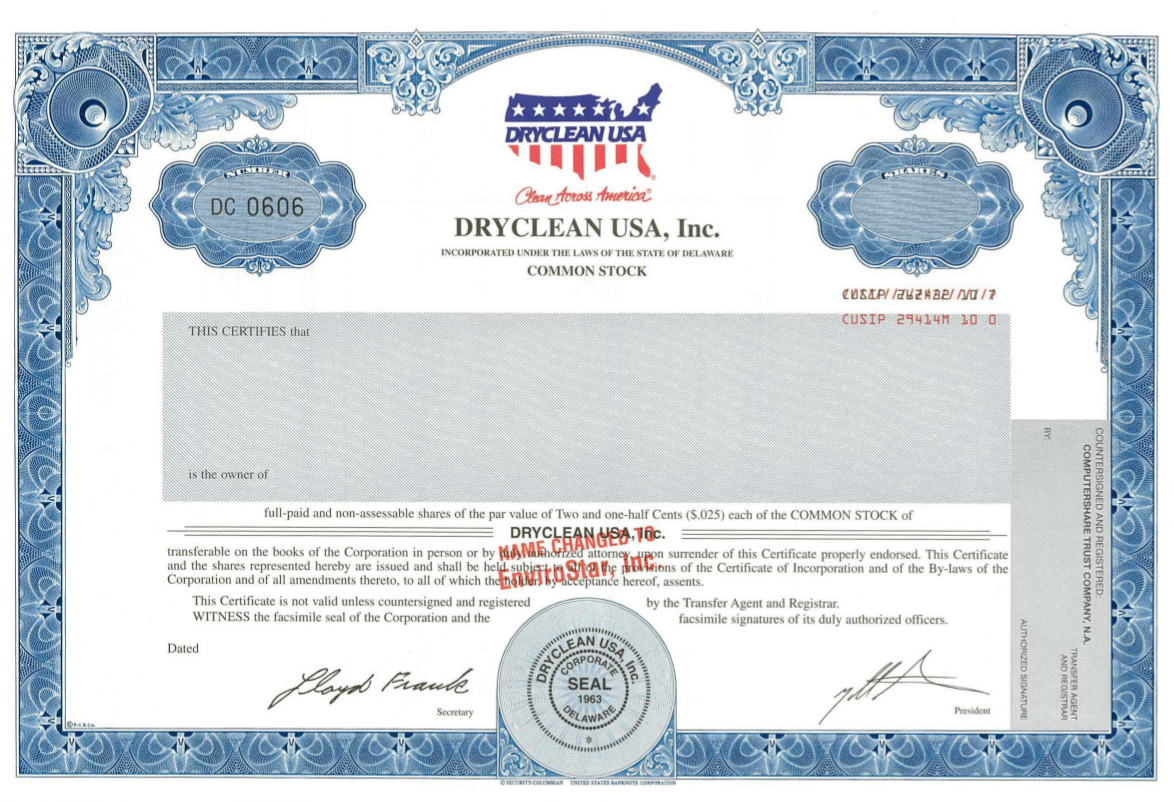 tUftt•A DRfCl.EJW USA ~ • - ~ II ' · ~~~ DRYCLEAN USA, Inc. INCORPORATED UNDER THE LAWS OF THE STATE OF DELAWARf. COMMON STOCK full-paid and non-assessable shares of the par value of Two and one-half Cents ($.025) each of the COMMON STOCK of DRYCLJ:i4~~,1~· trans ferable on the books of the Corporation in person or by t4AtJl.~!fM attornerw\tf.Pn surrender of this Certificate properly endorsed. This Certificate and the shares represented hereby are issued and shall be hel;l. su~.,Qlt~ flf r!JiWi~ns of the Certificate of Incorporation and of the By-laws of the Corporation and of all amendments thereto, to all of which thetnt\1\JJ·J '~~e"prance hereof, assents. This Certificate is not valid unless countersigned and registered WITNESS the facsimile seal of the Corporation and the Dated /~~ Secretary by the Transfer Agent and Registrar. facsimile signatures of its duly authorized officers. ~ / President
