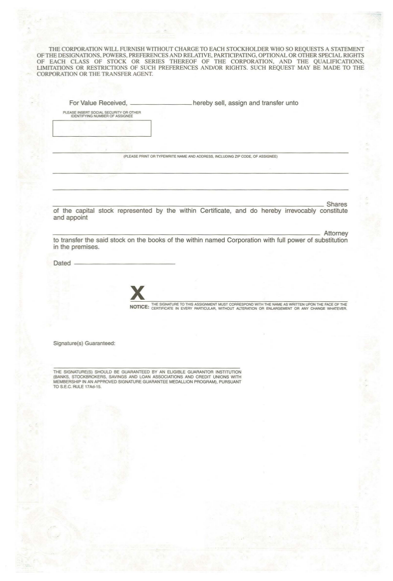 THE CORPORATION WILL FURNISH WITHOUT CHARGE TO EACH STOCKHOLDER WHO SO REQUESTS A STATEMENT OF THE DESIGNATIONS , POWERS, PREFERENCES AND RELATIVE, PARTICIPATING, OPTIONAL OR OTHER SPEC IAL RIGHTS OF EACH CL ASS OF STOCK OR SERI ES T HE REOF OF THE C ORPORATION, AN D THE QUALIFICATIONS, LlMlTATIONS OR RESTRICTIONS OF SUCH PREFERENCES AND/OR RIGHTS . SUCH REQUEST MAY BE MADE TO THE CORPORATION OR THE TRANSFER AGENT. For Value Received, hereby sell, assign and transfer unto PLEASE INSERT SOCIAL SECURITY OR OTHER IDENTIFYING NUMBER OF ASSIGN EE ,-I (PLEASE PRINT OR TYPEWRITE NAME AND ADDRESS. INCLUDING ZIP CODE. OF ASSIGNEE) __________________________________________________________________ Shares of the capital stock represented by the within Certificate, and do hereby irrevocably constitute and appoint Attorney to transfer the said stock on the books of the with in named Corporation with full power of substitution in th e premises. Dated X NOTICE: b~~~~~~:~7~T~~~~;~~~~UM~~~ ~~Ts:o~R~~~~~~~:~T~~~~~~:~~~~E:N~~A~~:~~A~~v~: Signature( s) Guaranteed: THE SIGNATURE(S) SHOULD BE GUARANTEED BY AN ELIGIBLE GUARANTOR INSTITUTION (BANKS. STOCKBROKERS. SAVINGS AND LOAN ASSOCIATIONS AND CREDIT UNIONS WITH MEMBERSHIP IN AN APPROVED SIGNATURE GUARANTEE MEDALLION PROGRAM) , PURSUANT TO S.E. C. RULE 17Ad·15.
