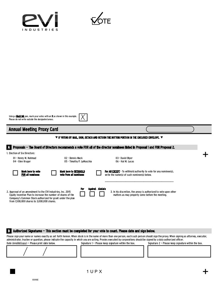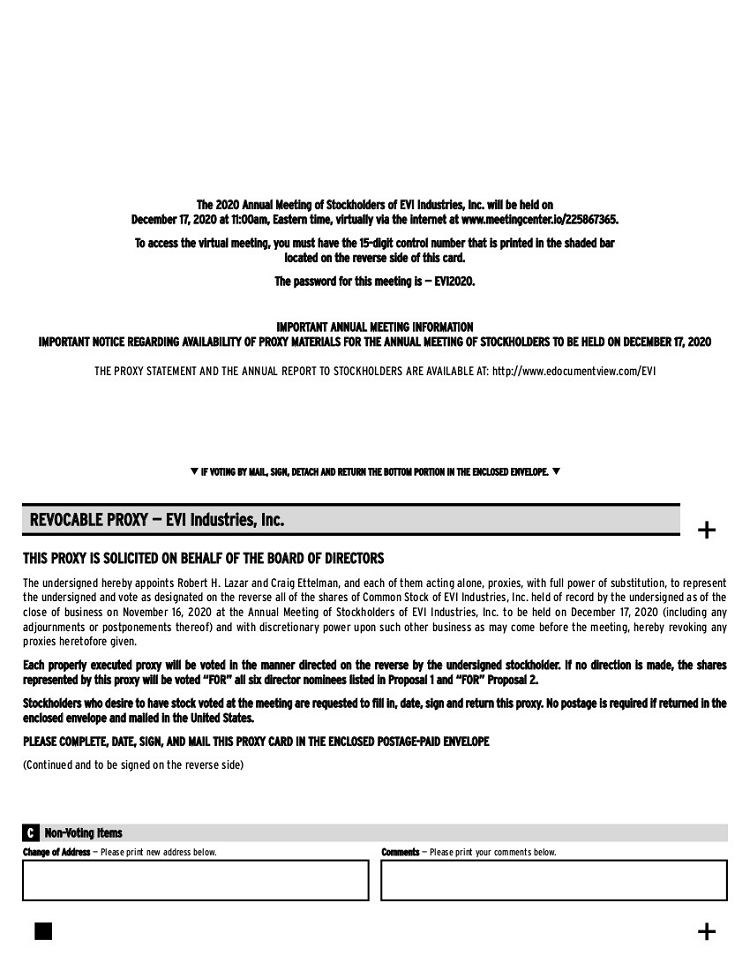 Using a black ink pen, mark your votes with an X as shown in this example. Please do not write outside the designated areas. Annual Meeting Proxy Card q IF VOTING BY MAIL, SIGN, DETACH AND RETURN THE BOTTOM PORTION IN THE ENCLOSED ENVELOPE. q A Proposals — The Board of Directors recommends a vote FOR all of the director nominees listed in Proposal 1 and FOR Proposal 2. 01 - Henry M. Nahmad 02 - Dennis Mack 03 - David Blyer + 1. Election of Six Directors: 04 - Glen Kruger 05 - Timothy P. LaMacchia 06 - Hal M. Lucas Mark here to vote FOR all nominees Mark here to WITHHOLD vote from all nominees For All EXCEPT - To withhold authority to vote for any nominee(s), write the name(s) of such nominee(s) below. 2. Approval of an amendment to the EVI Industries, Inc. 2015 Equity Incentive Plan to increase the number of shares of the Company’s Common Stock authorized for grant under the plan from 1,500,000 shares to 3,000,000 shares. For Against Abstain 3. In his discretion, the proxy is authorized to vote upon other matters as may properly come before the meeting. B Authorized Signatures — This section must be completed for your vote to count. Please date and sign below. Please sign your name or names exactly as set forth hereon. When stock is in the name of more than one person, each such person should sign the proxy. When signing as attorney, executor, administrator, trustee or guardian, please indicate the capacity in which you are acting. Proxies executed by corporations should be signed by a duly authorized officer. Date (mm/dd/yyyy) — Please print date below. Signature 1 — Please keep signature within the box. Signature 2 — Please keep signature within the box. 03CKGE 1 U P X + The 2020 Annual Meeting of Stockholders of EVI Industries, Inc. will be held on December 17, 2020 at 11:00am, Eastern time, virtually via the internet at www.meetingcenter.io/225867365. To access the virtual meeting, you must have the 15-digit control number that is printed in the shaded bar located on the reverse side of this card. The password for this meeting is — EVI2020. IMPORTANT ANNUAL MEETING INFORMATION IMPORTANT NOTICE REGARDING AVAILABILITY OF PROXY MATERIALS FOR THE ANNUAL MEETING OF STOCKHOLDERS TO BE HELD ON DECEMBER 17, 2020 THE PROXY STATEMENT AND THE ANNUAL REPORT TO STOCKHOLDERS ARE AVAILABLE AT: http://www.edocumentview.com/EVI q IF VOTING BY MAIL, SIGN, DETACH AND RETURN THE BOTTOM PORTION IN THE ENCLOSED ENVELOPE. q REVOCABLE PROXY — EVI Industries, Inc. + THIS PROXY IS SOLICITED ON BEHALF OF THE BOARD OF DIRECTORS The undersigned hereby appoints Robert H. Lazar and Craig Ettelman, and each of them acting alone, proxies, with full power of substitution, to represent the undersigned and vote as designated on the reverse all of the shares of Common Stock of EVI Industries, Inc. held of record by the undersigned as of the close of business on November 16, 2020 at the Annual Meeting of Stockholders of EVI Industries, Inc. to be held on December 17, 2020 (including any adjournments or postponements thereof) and with discretionary power upon such other business as may come before the meeting, hereby revoking any proxies heretofore given. Each properly executed proxy will be voted in the manner directed on the reverse by the undersigned stockholder. If no direction is made, the shares represented by this proxy will be voted “FOR” all six director nominees listed in Proposal 1 and “FOR” Proposal 2. Stockholders who desire to have stock voted at the meeting are requested to fill in, date, sign and return this proxy. No postage is required if returned in the enclosed envelope and mailed in the United States. PLEASE COMPLETE, DATE, SIGN, AND MAIL THIS PROXY CARD IN THE ENCLOSED POSTAGE-PAID ENVELOPE (Continued and to be signed on the reverse side) C Non-Voting Items Change of Address — Please print new address below. Comments — Please print your comments below. +
